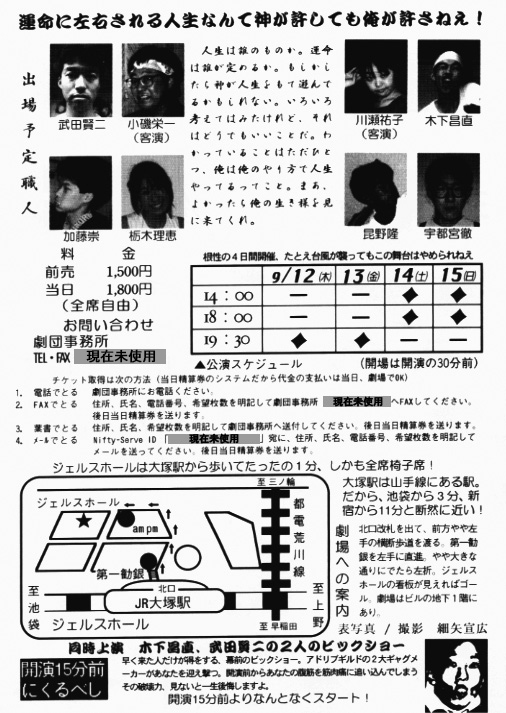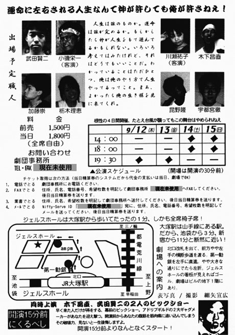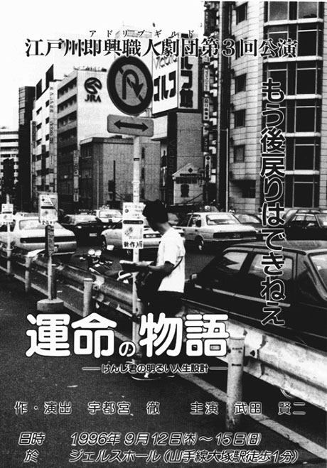 武田を強引に主人公に仕立てた作品。ダメダメな人生を歩むけんじ君、実は運命の台本によって人生を決められていることを知り、その台本を神から奪って、自分の人生をいいように作っていく話。勢いとギャグのみで芝居を作っていたような……。初日と二日目以降でラストが違う(※)、というドキドキワクワクな作品でもあった。