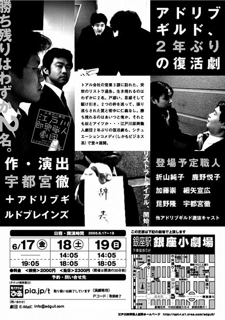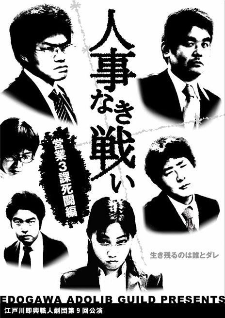とある会社の営業3課に訪れた突然のリストラ通告。生き残れるのはわずかに2名。戸惑い、思惑そして駆け引き。2つの枠を巡って、張り巡らされた罠と術中に仁義なし。勝ち残れるのはあいつと俺か、それとも奴とアイツか・・・江戸川即興職人劇団2年ぶりの復活劇も、サラリーマンシチュエーションコメディで堂々展開。